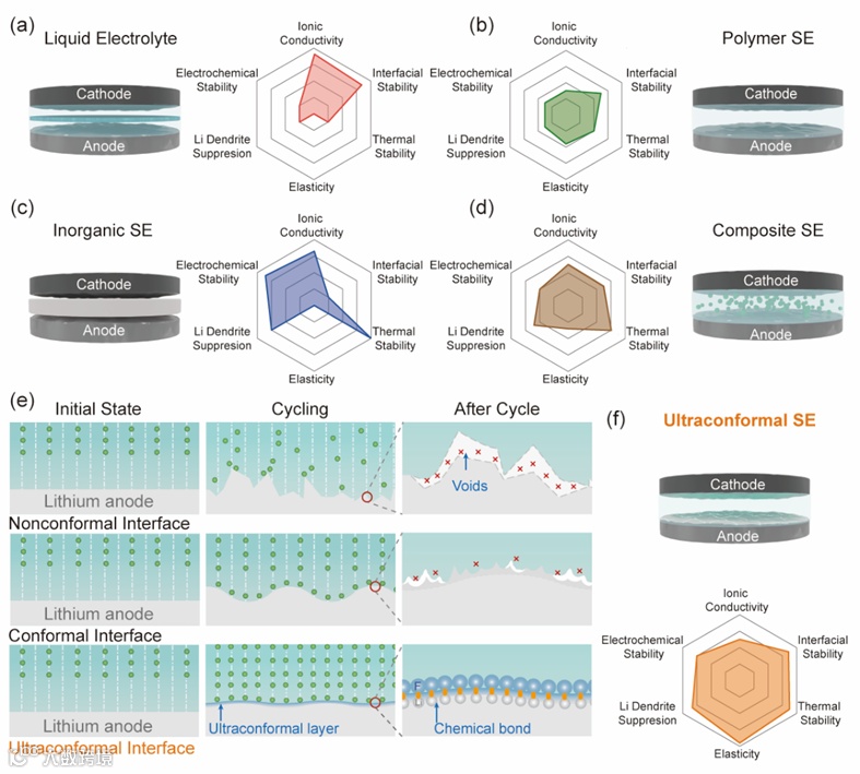 与液体电解质相比,固体电解质具有更高的热稳定性、更好的电化学稳定性和更好的机械性能,同时具有更高安全性(示意图1b-d)。固态电解质包括有机、无机、以及复合固态电解质,无机固态电解质(例如,氧化物、硫化物、氮化物等)有高的本征离子电导率、高硬度,在一定程度上可以抑制锂枝晶的形成,并具有良好的热稳定性。然而,由于差的固固接触,锂离子在刚性无机固态电解质和电极之间的界面处的迁移损耗较大。当前研究当报道了使用无机/有机中间层(例如Na、Ga、Ge、Zn、Li-Mg合金、MXenes聚丙烯腈、聚环氧乙烷等)来试图解决无机固态电解质与电极之间的界面问题,然而,所得到的非共形的中间层不能承受在充放电过程中在界面处的机械变化,同时由于异质介质的引入进一步阻碍了锂离子的传输,(示意图1e,顶部)。