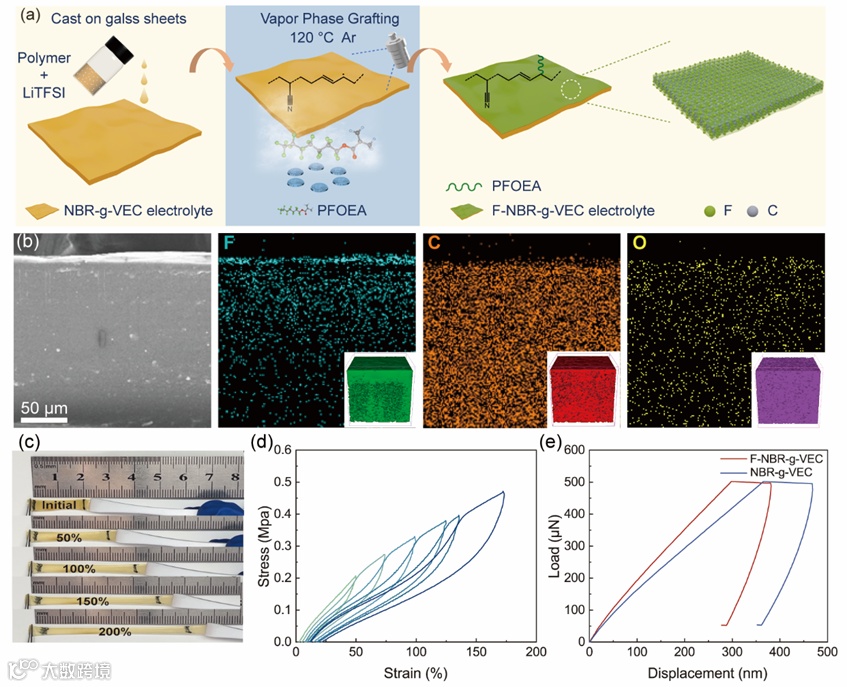 飞行时间二次离子质谱显示,气相氟化策略未增加电解质厚度并保持了橡胶基体的弹性,最大拉伸长度可达250%,法向弹性模量可达390 MPa。