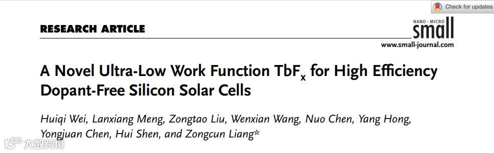 近日,来自中山大学的梁宗存教授,在国际知名期刊Small上发表题为“A Novel Ultra-low Work Function TbFx for High Efficiency Dopant-free Silicon Solar Cells”的观点文章。