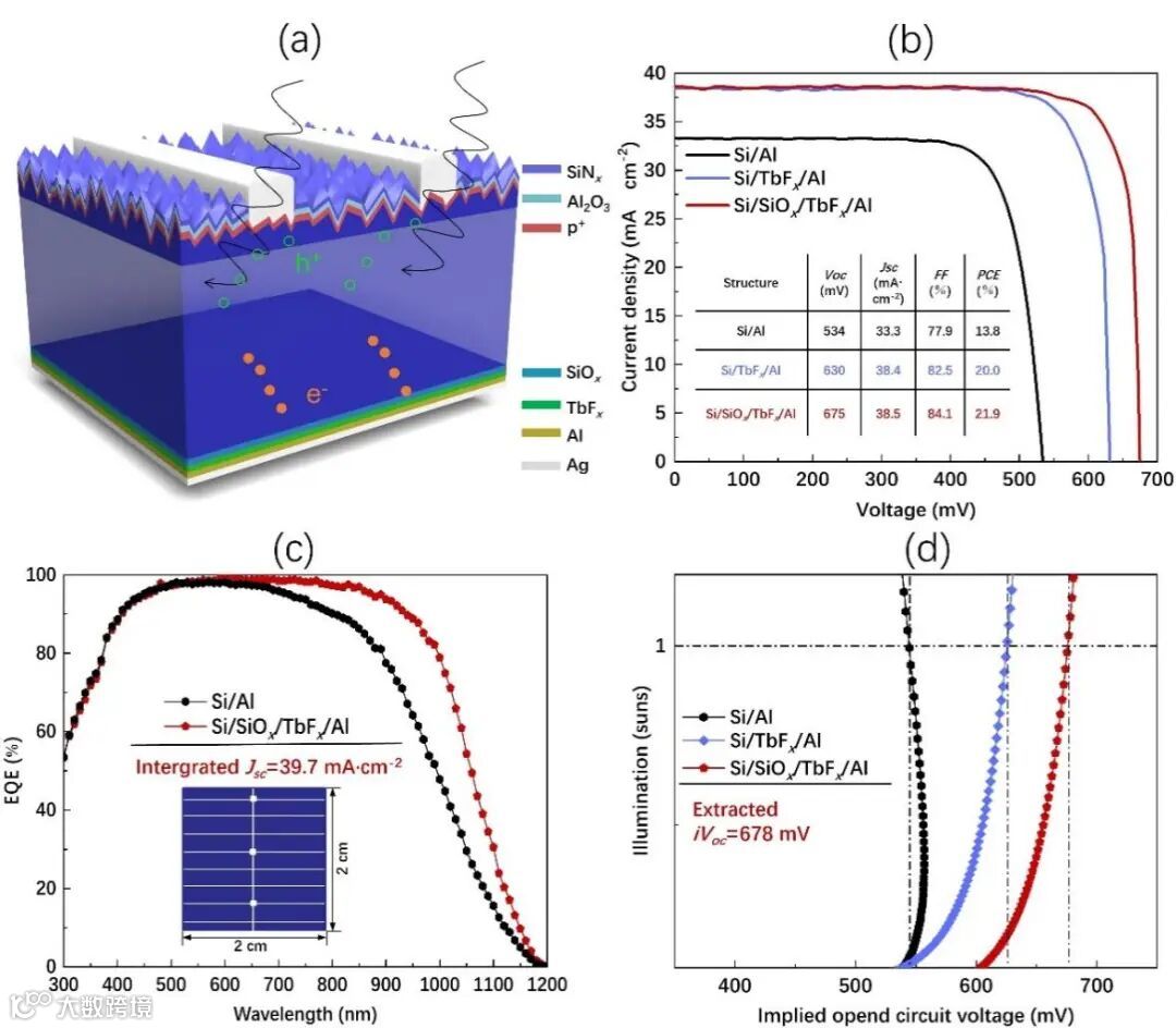 图1. SiOx/TbFx/Al电子选择性接触应用在免掺杂晶体硅太阳电池取得的性能