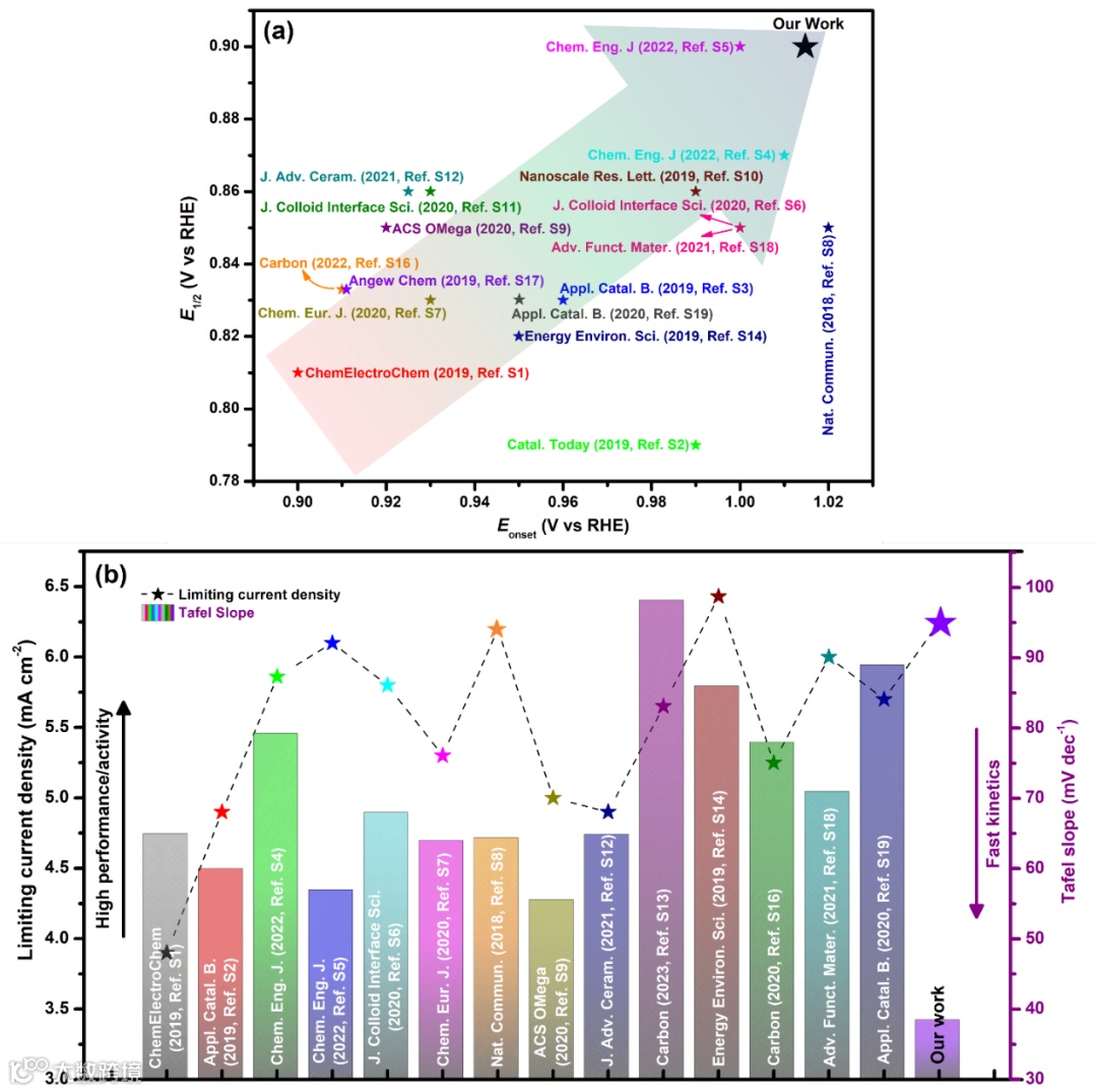 从 Eonset、E1/2、Tafel 斜率、JL 和稳定性/耐久性等参数来看,催化剂NC-1000的 ORR 性能与 Pt/C(20 wt.%)相当,优于之前报道的大多数氮掺杂碳材料。