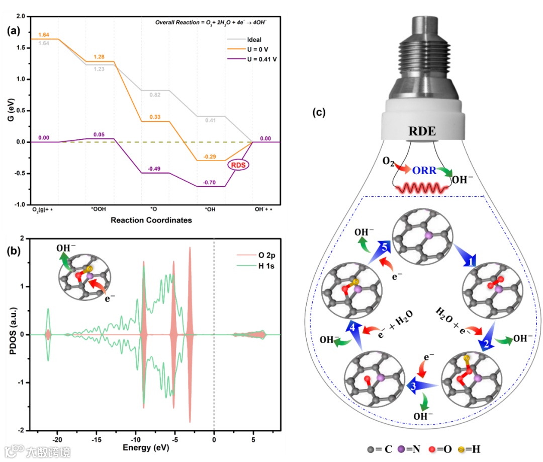 图4 (a)碱性电解质中遵循ORR机制的各种反应中间体的吉布斯自由能; (b)NC-1000中石墨氮位点上参与决速步骤的O 2p和H 1s的态密度(PDOS);(c)相应的ORR反应机制