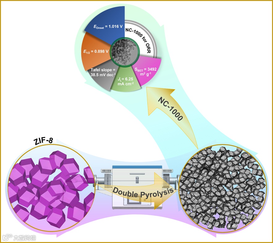 ZIF-8因其精细的孔径结构和有机配体中丰富的碳、氮含量,已作为3D氮掺杂碳材料的制备前驱体被广泛研究。但大多数ZIF-8衍生碳材料比表面积小(一般低于1000m2 g-1)、石墨氮含量低,导致其ORR反应活性较差。因此,同时实现ZIF-8衍生碳材料的大表面积和高石墨氮含量一直是一项挑战。