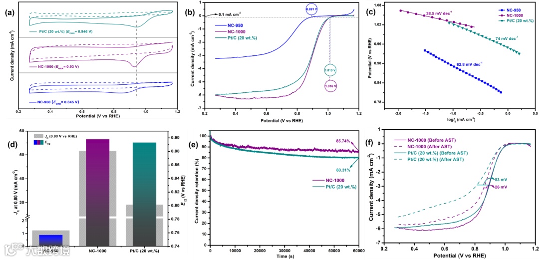 图2 (a)0.1M KOH溶液中O2饱和(实线)和、N2饱和(虚线)的 LSV 曲线;(b) O2饱和 0.1M KOH溶液中扫描速率为10 mV s-1和 1600 rpm时的 LSV 曲线;(c) NC-950、NC-1000 和 Pt/C(20 wt.%)的相应塔菲尔斜率;(d) NC-950 、NC-1000 和 Pt/C(20 wt.%)在 0.80 V 和 E1/2 时的动力学电流密度 ;NC-1000 和 Pt/C(20 wt.%)在O2饱和的 0.1 M KOH 溶液中,以 1600 rpm和 100 mV s-1 的扫描速率,(e)在 0.6 V 条件下 60,000 s计时电流密度保持和(f)在 0.1-0.6 V 的电位条件下进行 5000 次加速应力测试 (AST) 前后的LSV 曲线。