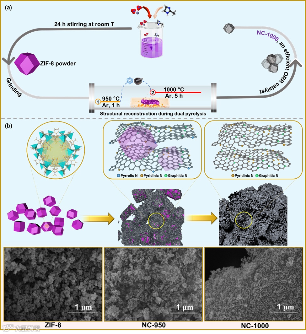 图1 (a) ZIF-8、NC-950 和 NC-1000 的合成策略;(b) ZIF-8、NC-950 和 NC-1000 的结构示意和形态表征。