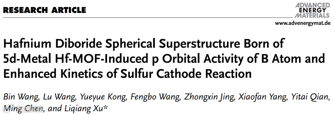近日,来自山东大学的徐立强教授课题组在国际知名期刊Advanced Energy Materials上发表题为“Hafnium Diboride Spherical Superstructure Born of 5d‐Metal Hf‐MOF‐Induced p Orbital Activity of B Atom and Enhanced Kinetics of Sulfur Cathode Reaction”的实验论文。