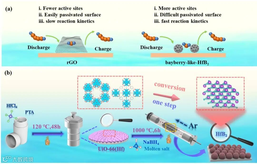 稳定、高效的电催化剂能够有效地加速硫物种的转化速率,从而提高锂硫电池的循环寿命和库伦效率,因此被认为是当下解决多硫化物穿梭效应的“金标准”。在本篇文章中,作者通过以Hf-MOF为前驱体,制备了由纳米颗粒组装的HfB2球体,并通过研究发现5d金属Hf可以诱导增强B原子的p轨道活性,从而增强硫的反应动力学,提高电池电化学性能。