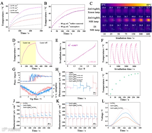 图4. (A) 不同功率密度(80μg mL−1)和(B) 不同形貌的AgBiS2温度变化曲线。(C) 激光照射期结束时溶液的相应红外热像仪图像(808 nm,2 W cm−2)。(D) 驱动力温度变化。(E) 冷却期间–Lnθ与时间数据的线性拟合图。(F) 在六个开/关近红外激光周期下的光热稳定性测试。(G) SrTiO3纳米球的不对称相位曲线和振幅环-电压曲线。(H) 不同材料的光电流响应变化。(I) 光热-热释电平台的温度变化。在(J) 不同温度和(K) 恒定温度(50 °C)SrTiO3、ZnO/AgBiS2和ZnO/AgBiS2/SrTiO3的光电流响应。(L) 通过电化学工作站输出SrTiO3、ZnO/AgBiS2和ZnO/AgBiS2/SrTiO3的热释电势。