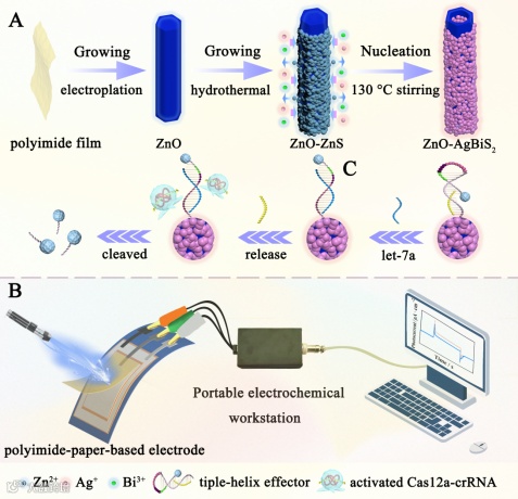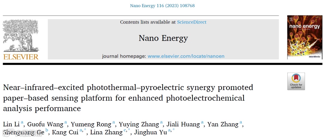 近日,来自济南大学于京华教授,在国际知名期刊Nano Energy上发表题为“Near–infrared–excited photothermal–pyroelectric synergy promoted paper–based sensing platform for enhanced photoelectrochemical analysis performance”的文章。该文章使用纸芯片与聚酰亚胺(PI)薄膜基底相结合构造柔性基底,并利用光热-热释电技术实现了柔性聚酰亚胺纸电极的能量收集。在近红外辐射下,具有光热活性的ZnO/AgBiS2电子构型和具有热释电性能的SrTiO3效应体通过热场和热释电场的波动实时切换,实现近红外响应高效能源转化。