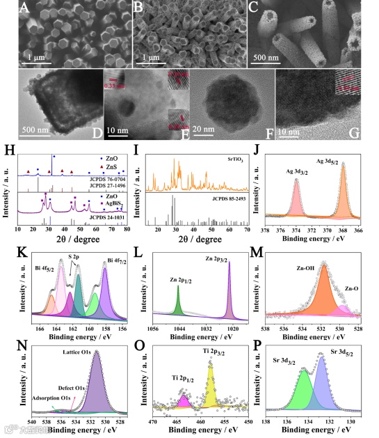 图2. (A) ZnO,(B) ZnO/ZnS和(C)空心ZnO/AgBiS2纳米棒的SEM图像。(D,E) 空心ZnO/AgBiS2纳米棒和(F,G) SrTiO3纳米球的TEM和HRTEM图像。(H,I) ZnO/ZnS、空心ZnO/AgBiS2纳米棒和SrTiO3纳米球的XRD谱图。(J) Ag 3d, (K) Bi 4f和S 2p, (L) Zn 2p, (M) Zn-O, (N) O 1s, (O) Ti 2p和(P) Sr 3d峰的XPS光谱。