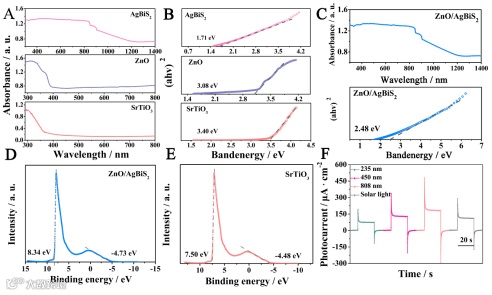 图3. AgBiS2、ZnO、ZnO/AgBiS2和SrTiO3的(A,C)DRS光谱和(B,C)Tauc图。(D,E)ZnO/AgBiS2和SrTiO3的UPS光谱。(F)ZnO/AgBiS2/SrTiO3在不同波长光激发下的光电流响应曲线。