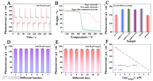 图5. (A) 光热-热释电传感平台和(B) 柔性聚酰亚胺纸基电极的稳定性和可重复性。(C) 光热-热释电传感平台的选择性研究。(D) 不同批次的光电响应,(E) 在4°C下保存21天后的光电响应。(F) 不同浓度let-7a的光电流响应校准曲线。