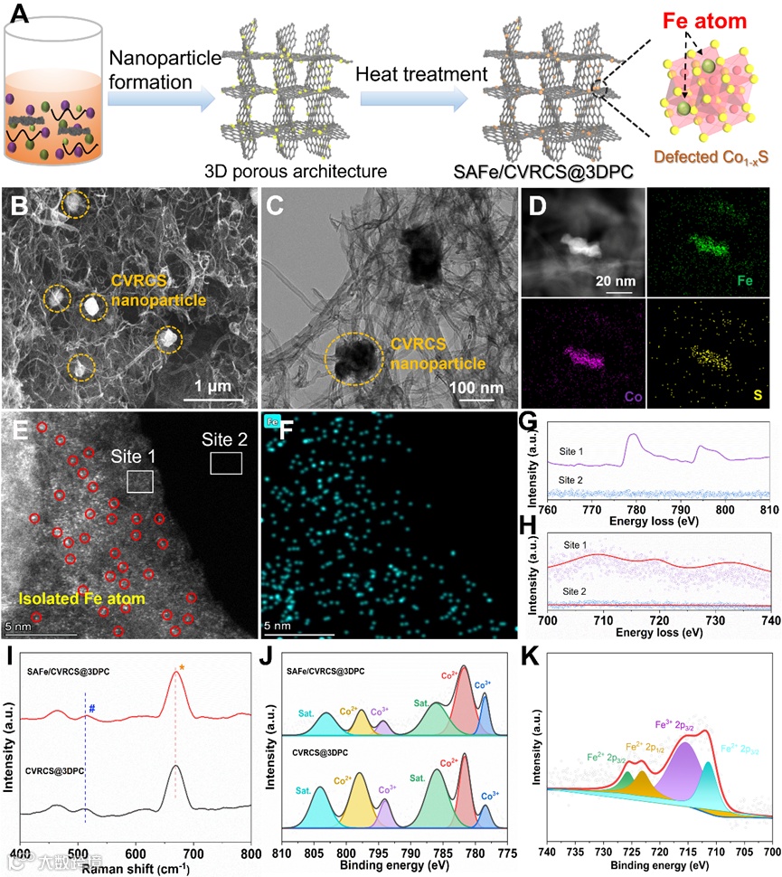 首先,通过密度泛函理论(DFT)计算确定了CVRCS 缺陷位点铁原子的稳定性。位于Co 原子空位的Fe单原子比 CVRCS 缺陷位点处的 Fe 单原子具有低得多的自由能,表明构建“SAC-in-Defects”结构的可行性。为了揭示SAFe/CVRCS 如何推动 Li+从其Li+-Solvents溶剂化结构解离以及Li0在表面扩散,不同溶剂化 程度的Li离子在形成Li(DME)n+和Li(DOL)n+ (n= 1,2,3,4) 时的还原电位进行了计算。Li+的配位数越大,必须克服的去溶剂化势垒就越高。在 SAFe/CVRCS 存在的情况下,与Li+配位的 DME 分子和 DOL 分子倾向于移动到 SAFe/CVRCS表面,表明这些去溶剂化过程正在自发地进行(G < 0)并释放Li+,而无需消耗额外的能量。SAFe/CVRCS引入体系后电子转移到催化剂表面后,导致溶剂从Li+溶剂化鞘中解离。原始Li表面上的Li0原子由于0.82 eV的高势垒而难以扩散。同时相比之下,Li原子很容易在SAFe局部位点周围扩散,势垒为0.14 eV,大约比金属Li表面低6倍,证实了SAFe/CVRCS@3DPC在促进Li0原子进一步横向扩散方面的显着贡献电镀时无任何垂直枝晶生长。采用了水热法与热处理法相结合的手段,结合HAADF-STEM, EELS,Raman, XPS等表征方法证实了SAC-in-Defects。