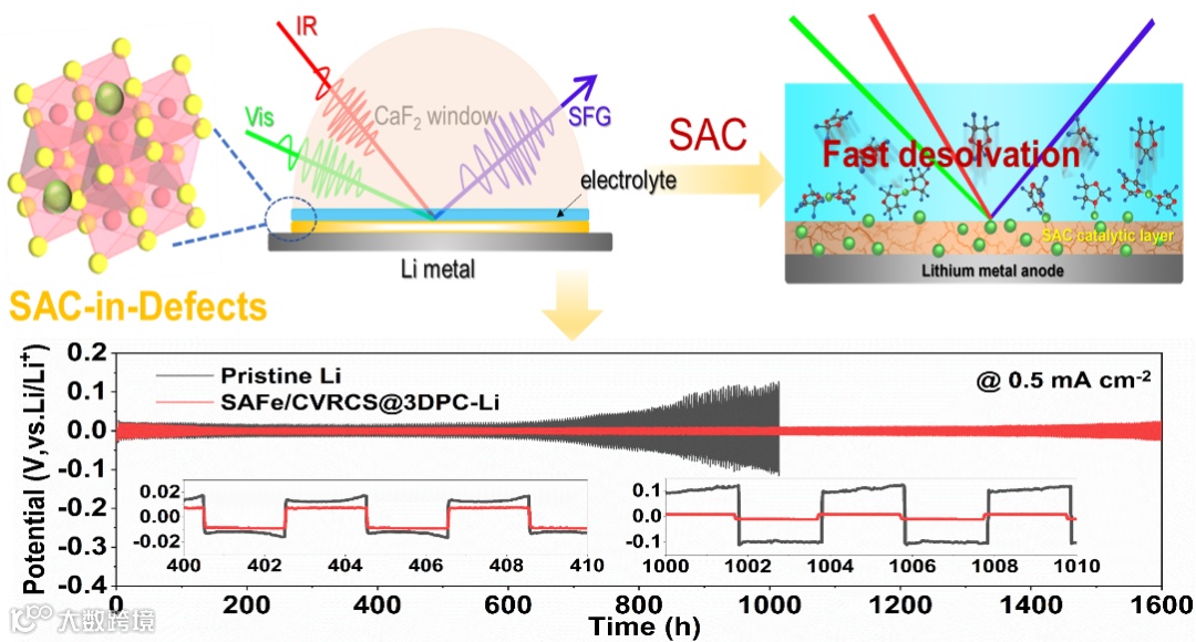 针对上述问题,中科院苏州纳米所蔺洪振研究员联合德国卡尔斯鲁厄理工学院王健博士、Stefano Passerini院士从界面解离动力学角度,提出了界面催化去溶剂化策略,构筑“SAC-in-Defects”型活性催化剂,降低溶剂化锂离子在界面处的解离及中性锂原子在金属锂表面横扩散的势垒,改善其在电极/电解液界面、金属表面内的动力学传输特性。首次采用自行构筑设计的原位电化学和频振动光谱(SFG)追踪了Li+-Solvents结构分子在“SAC-in-Defects”表面的演变过程,解析了催化去溶剂化的作用机制,对未来发展高容量长寿命且无枝晶的快速充放电的金属电池具有启示作用。此工作以“Interfacial "Single-Atom-in-Defects" Catalysts Accelerating Li+ Desolvation Kinetics for Long-lifespan Lithium Metal Batteries”为题,发表在Adv. Mater.。
