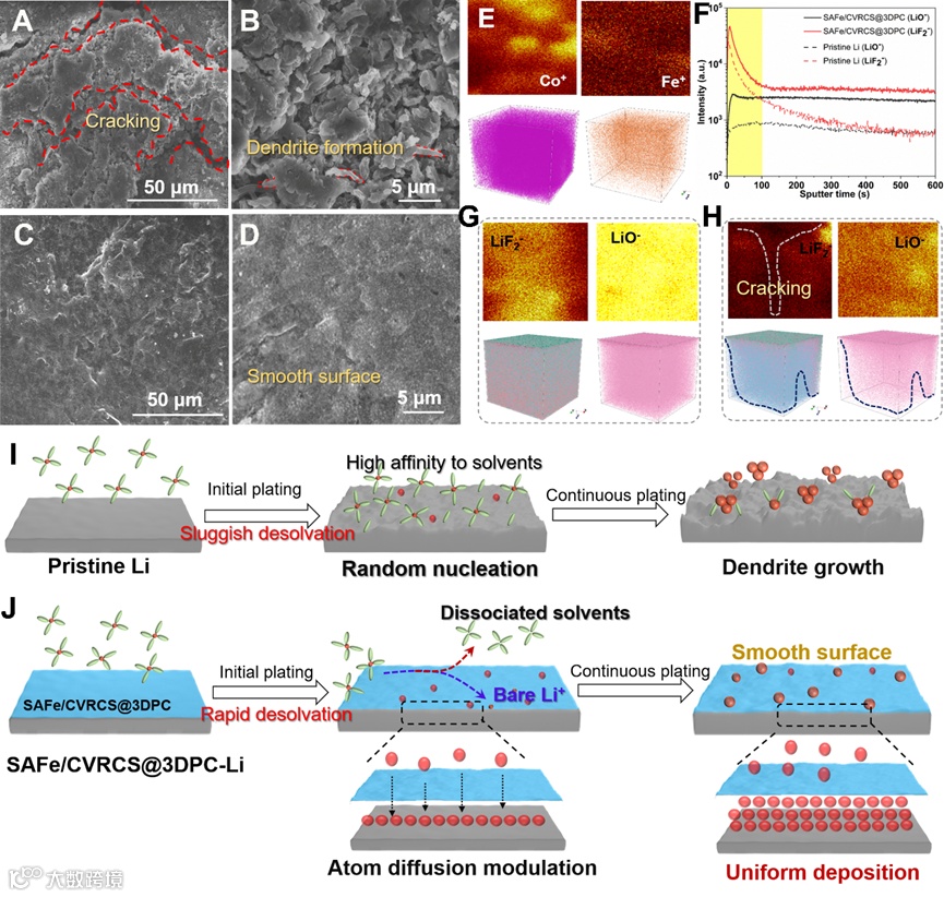 具有SAFe/CVRCS@3DPC催化层的对称电池的电荷传递电阻降低,传质动力学增强,表明生成的自由Li+传输速度快,能够在没有任何短路的情况下持续1600小时的循环稳定性。值得注意的是,SAFe/CVRCS@3DPC-Li即使在电流密度高达5 mA cm−2下仍然可以保持在73 mV左右的过电位,远低于相同条件下的原始Li金属(334 mV)。非原位SEM表明,纯金属锂具有明显可见苔藓锂的生长和特征裂纹,在高分辨率的SEM图像中可以观察到清晰的Li枝晶。相反,SAFe/CVRCS@3DPC调控的Li电极呈现出相对光滑的电镀表面,没有任何枝晶。此外,通过飞行时间二次离子质谱(TOF-SIMS)检测了三维形态和物种分布。Fe+物种相应地位于CVRCS上,显示了电镀/剥离后Fe的缺陷位锚定原子结构。随着溅射时间的增加,Li相关物种的高强度,表示调制的Li表面有更多的Li源。与原始Li中明显的裂纹和枝晶相比,SAFe/CVRCS@3DPC调制的Li表面光滑均匀,以及分布良好的镀锂层。