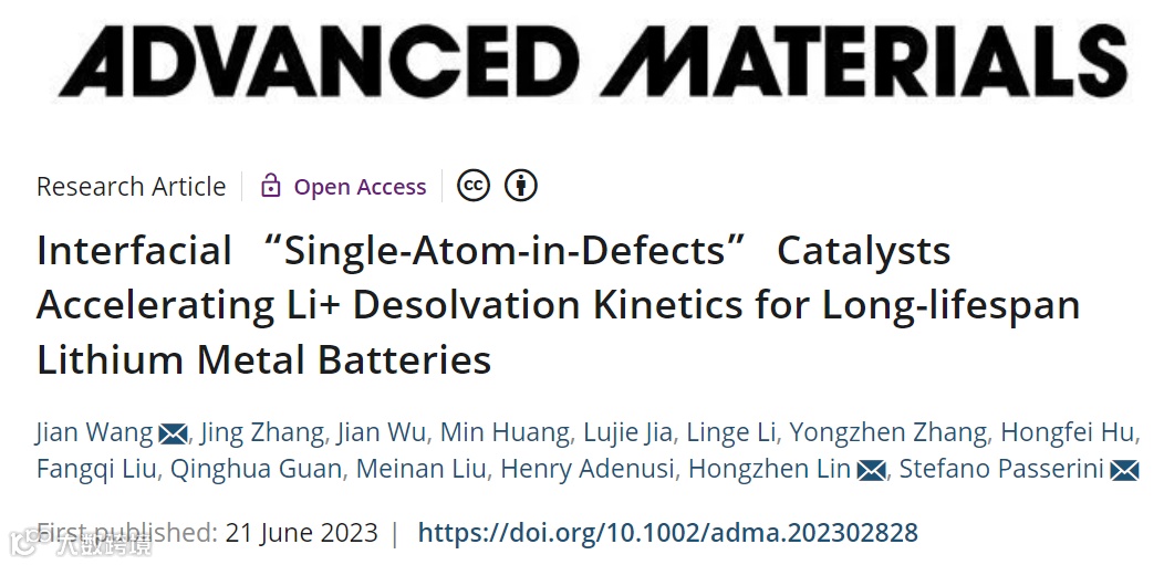 Wang, J. ; Zhang, J.; Wu, J.; Huang, M.; Jia, L.; Li, L.; Zhang, Y.; Hu, H.; Liu, F.; Guan, Q.; Liu, M.; Adenusi, H.; Lin, H.*; Passerini, S*. Interfacial "Single-Atom-in-Defects" Catalysts Accelerating Li+ Desolvation Kinetics for Long-lifespan Lithium Metal Batteries. Adv. Mater. 2023, e2302828