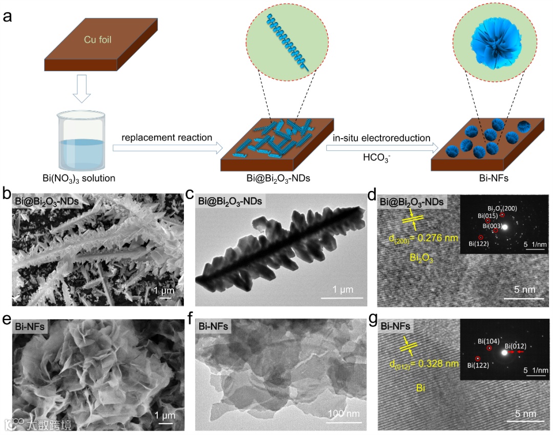 图1.(a)在铜箔上生长Bi-NFs的合成过程示意图;(b-d)Bi@Bi2O3-NDs的(b)SEM,(c)TEM,(d)HRTEM图像和相应的SAED图案(图3.1d中的插图);(e-g)Bi-NFs的(e)SEM,(f)TEM,(g)HRTEM图像和相应的SAED图案(图1g中的内嵌图)。