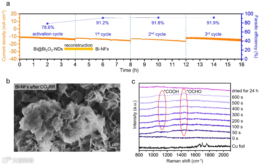 图 5(a)在长时间CO2电还原过程中,在-0.9 V(vs. RHE)的施加电位下,Bi-NFs的电流密度和FEFormate;(b)Bi-NFs在16小时的稳定性测试后的SEM图像;(c)从Bi-NFs表面记录的时间相关的原位拉曼光谱。