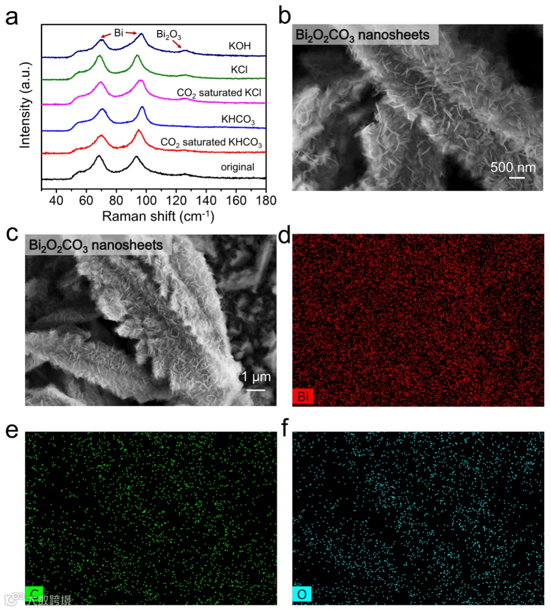 图2.(a)Bi@Bi2O3-NDs样品在不同电解液中于-1.0 V(vs. RHE)电还原2小时后的拉曼光谱;(b,c)Bi2O2CO3纳米片在不同放大倍数下的SEM照片。(d-f)图3.7c中Bi2O2CO3纳米片的相应EDX元素映射。
