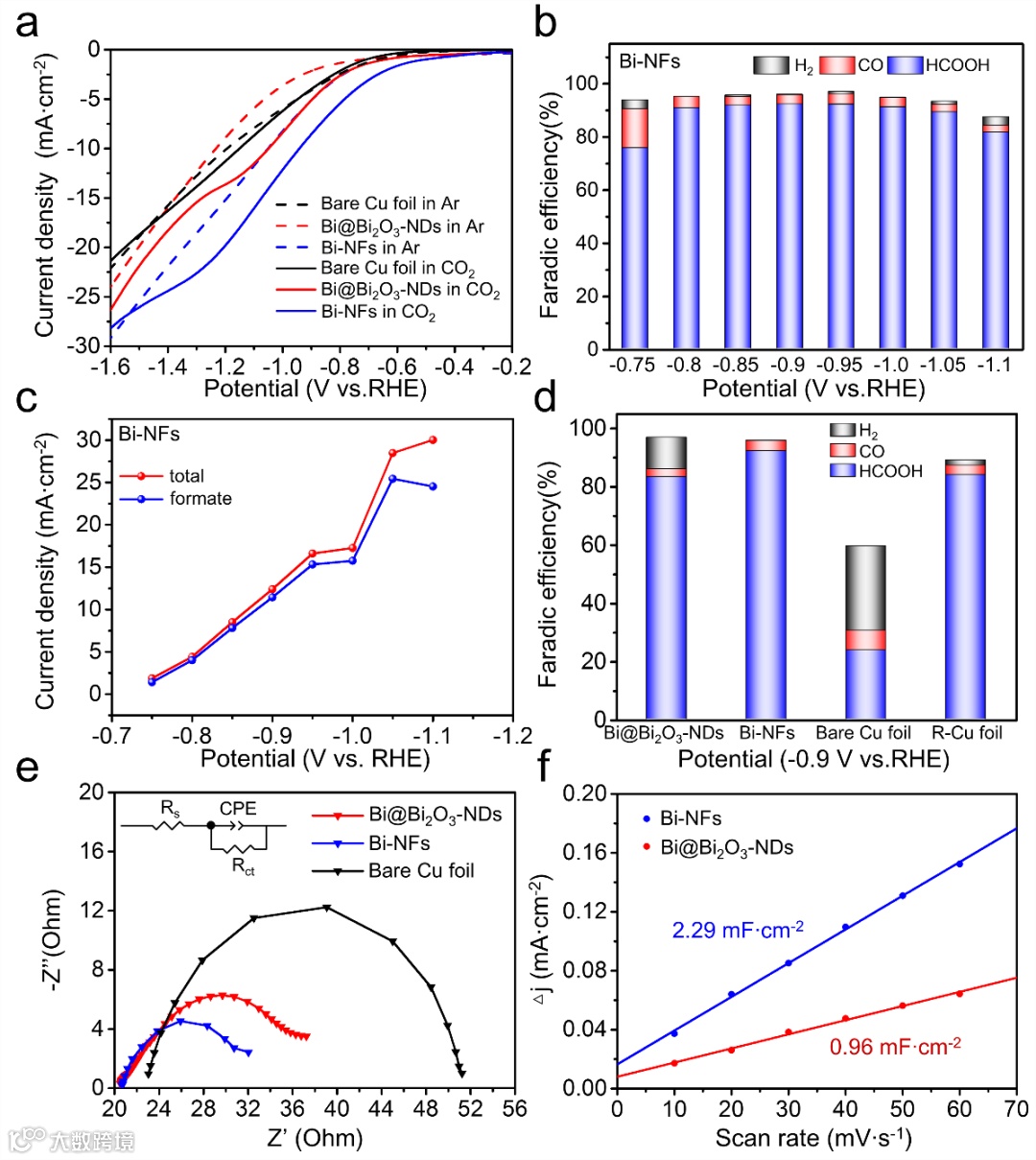 图4(a)裸Cu箔、Bi@Bi2O3-NDs和Bi-NFs在CO2 或Ar饱和的0.1 M KHCO3电解液中的LSV曲线;(b)Bi-NFs在CO2饱和的0.1 M KHCO3水溶液中在不同施加电位下生成还原产物的法拉第效率;(c)在不同施加电位下,在CO2饱和的0.1 M KHCO3水溶液中Bi-NFs的总电流密度和甲酸的部分电流密度;(d)Bi@Bi2O3-NDs、Bi-NFs、裸Cu箔和R-Cu箔在CO2饱和的0.1 M KHCO3水溶液中在-0.9 V(vs. RHE)下生成的还原产物的法拉第效率(C2产物见图3.16);(e)在0.1 M CO2饱和的KHCO3溶液中于-0.9 V(vs. RHE)下测得的裸铜箔、Bi@Bi2O3-NDs和Bi-NFs的奈奎斯特图;(f)Bi@Bi2O3-NDs和Bi-NFs的充电电流密度差异(Δj)与扫描速率的关系。