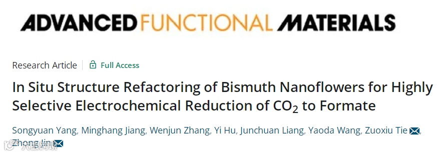 近日,南京大学化学化工学院金钟教授团队在国际知名期刊Advanced Functional Materials上发表题为“In Situ Structure Refactoring of Bismuth Nanoflowers for Highly Selective Electrochemical Reduction of CO2 to Formate”的学术论文。该论文探究了Bi基材料于电催化CO2还原过程中的原位重构过程对活性位点的影响。