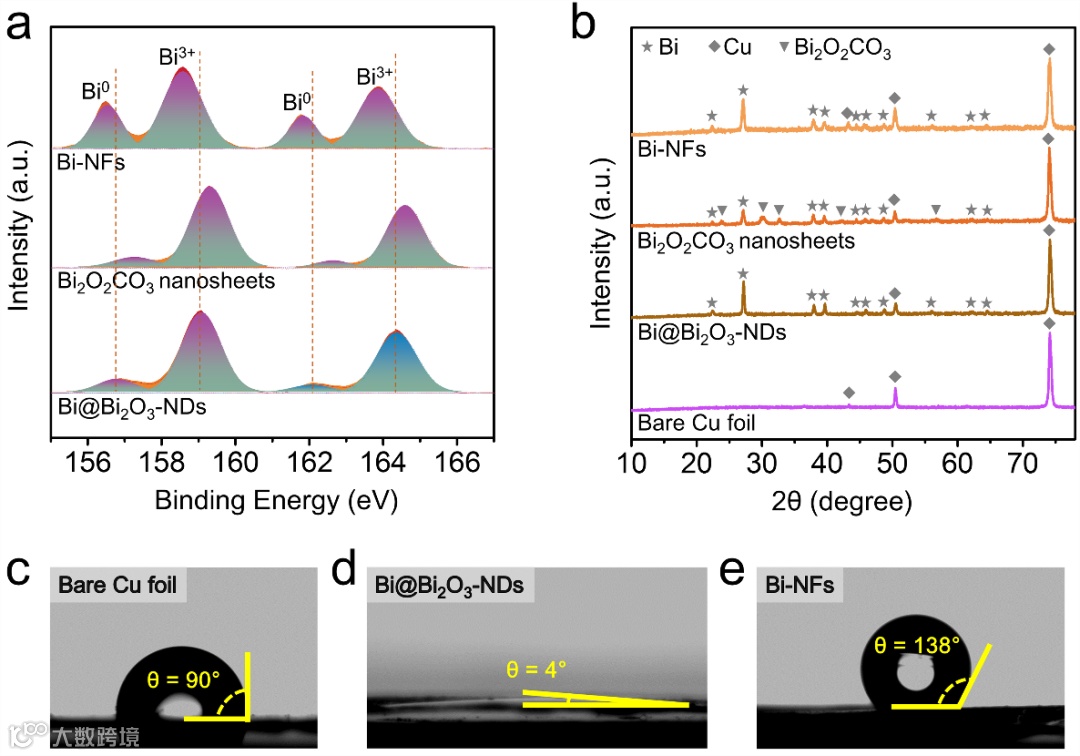 图3.(a)Bi@Bi2O3-NDs,Bi2O2CO3纳米片和Bi-NFs的Bi 4f区域的高分辨率XPS谱图。所有XPS结果均经由标准C 1s峰校正;(b)Bi-NFs、Bi2O2CO3纳米片、Bi@Bi2O3-NDs和Cu箔的XRD图;(c)Cu箔、(d)Bi@Bi2O3-NDs和(e)Bi-NFs与去离子水的接触角。