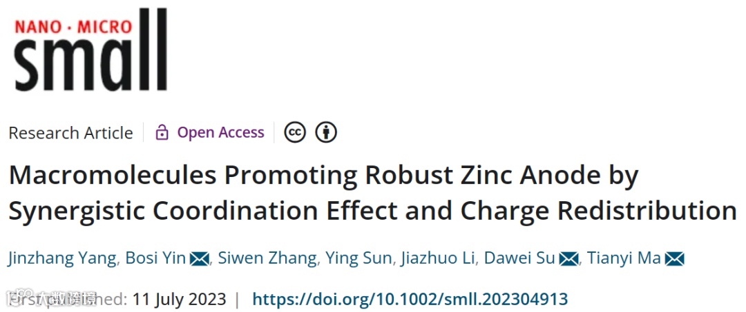 Jinzhang Yang, Bosi Yin*, Siwen Zhang, Ying Sun, Jiazhuo Li, Dawei Su*, and Tianyi Ma*, Macromolecules Promoting Robust Zinc Anode by Synergistic Coordination Effect and Charge Redistribution. Small, 2023, 2304913.
