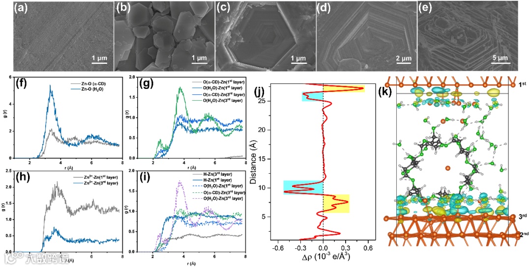 (a)-(e)锌负极在循环不同时间后的扫描电镜显微照片;(f)-(i)AIMD计算径向分布函数;(j)二维平均电荷密度差图;(k)三维电荷密度差图。