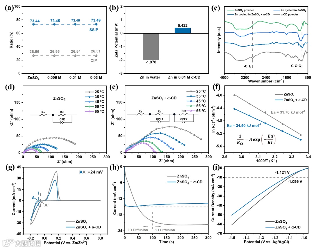 (a)电解液中SSIP和CIP比率;(b)Zeta电位;(c)Zn负极的FTIR光谱;(d)-(e)不同温度下不同电解液的EIS曲线;(f)不同电解液的电荷转移活化能;(g)Zn||Cu电池的循环伏安曲线;(h)不同电解液的计时电流曲线;(i)HER性能曲线;(a)电解液中SSIP和CIP比率;(b)Zeta电位;(c)Zn负极的FTIR光谱;(d)-(e)不同温度下不同电解液的EIS曲线;(f)不同电解液的电荷转移活化能;(g)Zn||Cu电池的循环伏安曲线;(h)不同电解液的计时电流曲线;(i)HER性能曲线;