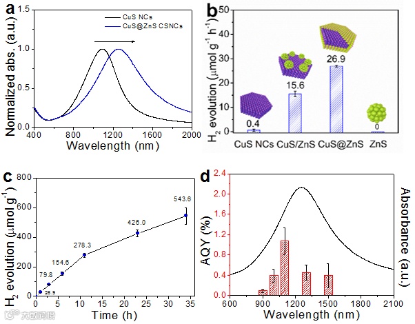 如图4a所示,CuS NCs和CuS@ZnS CSNC分别在1090 nm和1254 nm处具有强LSPR峰。作为比较,还合成了CuS/ZnS核/卫星结构纳米异质结HNCs。在红外光谱下光催化析氢(HER)速率,CuS@ZnS CSNCs为26.9 μmol h−1 g−1,分别是原始CuS NCs(0.4 μmol h–1 g−1)和CuS/ZnS HNCs(15.6 μmol h-1 g−1)的67.3倍和1.7倍。CuS@ZnS CSNCs在近红外光照射34小时下仍然表现出优异的稳定性(图4c)。此外CuS@ZnS CSNCs在1100 nm的波长下为1.07 %(图4d),高于CuS/ZnS HNCs(0.38 %)。