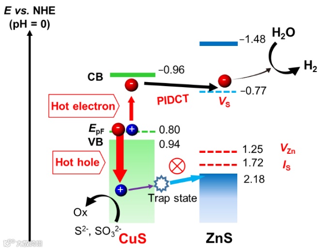 制备了CuS@ZnS核壳纳米晶异质结(CSNCs)。光催化转移机制如图1所示,与传统肖特基界面上的直接等离子体电子或空穴转移途径相比,具有缺陷位点的CSNCs显示出独特的机制。