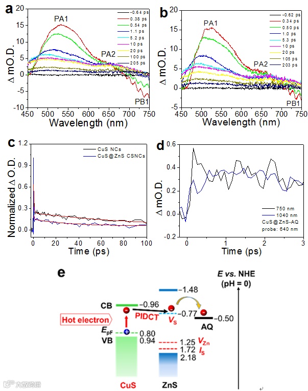为了进一步验证新提出的PIDCT,进行了飞秒瞬态吸收(TA)研究。CuS纳米晶体和CuS@ZnS CSNC通过使用700 nm激光激发CuS的LSPR模式,分别如图4a和4b所示,清楚地观察到可见光区域中的两个光吸收峰,可以归因于空穴的捕获。在700 nm激发下,对于CuS NCs在650 nm处的动力学图谱,拟合的两个成分分别为0.48 ps和101 ps(图5c)。相比之下,CuS@ZnS CSNCs呈现出更快的转移速度。使用电子转移指示剂分子蒽醌二羧酸(AQ)可以进一步证实近红外光诱导的等离子体电子转移。CuS NCs和CuS@ZnS CSNCs在750 nm和1040 nm激光激发下与AQ分子配位。如图4d所示,在640 nm处探测AQ分子阴离子自由基的不同特征。这表明近红外诱导的等离子体电子可以从CuS或CuS@ZnS CSNC与AQ分子的结合。此外,我们没有观察到等离子体空穴转移的信号,这表明处于捕获状态的空穴不能从CuS转移到ZnS。我们认为等离子体电子转移发生如图5e所示。通过计算得出CuS@ZnS CSNCs中热电子从CuS到ZnS的S空位转移的量子效率为29.2 %。