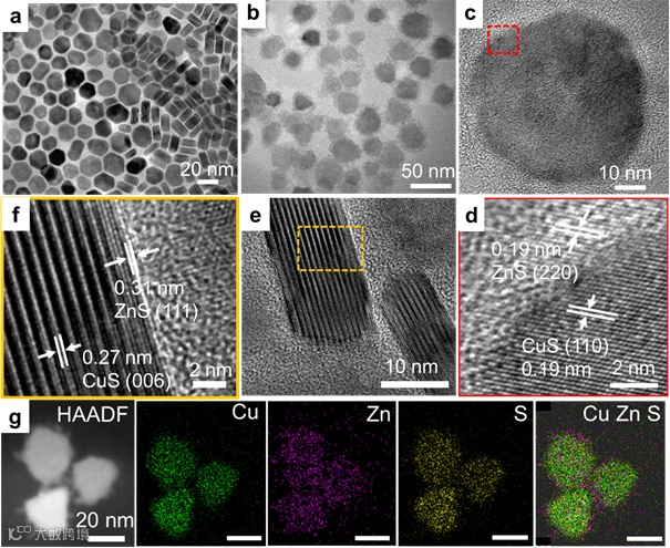 从TEM图与Mapping(图2)可知,CuS@ZnS使用圆盘状CuS NCs和随后原位生长的ZnS相形成核壳结构,通过种子介导的方式制备了CSNCs。其中CuS纳米晶体(NCs)呈现出尺寸为22.4±5.7 nm、厚度为7.3±1.6 nm的均匀分散的盘状。通过种子介导生长厚度为3.7±0.7nm的ZnS来包覆CuS NCs,最终形成CuS@ZnS核壳结构。