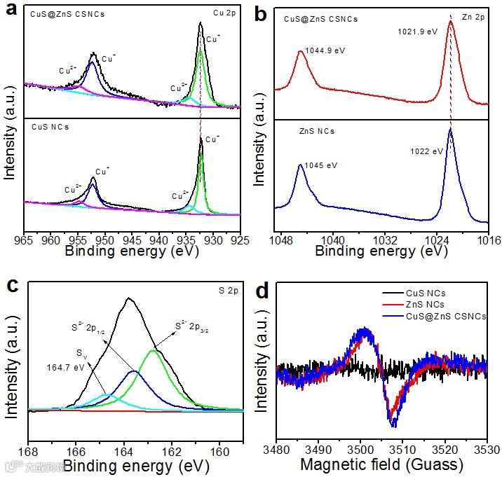 用X射线光电子能谱(XPS)测定了光催化剂的价态和表面化学成分。如图3a所示,CuS NCs中Cu 2p的峰分为Cu+,分别归属于在932.3 eV的2p3/2轨道和峰值在952.3 eV的2p1/2轨道。而Cu2+峰值分别在934.4 eV和954.8 eV。这证明CuS NCs中Cu存在两种价态。与CuS NCs相比CuS@ZnS CSNCs移动到约0.1 eV的更高结合能。相反,如图3b所示,ZnS NCs中Zn2+分别在1021.9 eV和1044.9 eV,而CuS@ZnS CSNCs向约0.1 eV的较低结合能移动。这表明,由于电子可以从CuS转移到ZnS ,ZnS周围电子密度的增加,导致结合能的降低,这意味着内部电场的形成。为了进一步验证CuS@ZnS中是否存在S空位,进行了电子顺磁共振(EPR)测量。如图3d所示,CuS@ZnS在g = 2.003时,CSNCs比ZnS NCs具有更强的信号,表明CuS@ZnS存在大量的S空位数目。