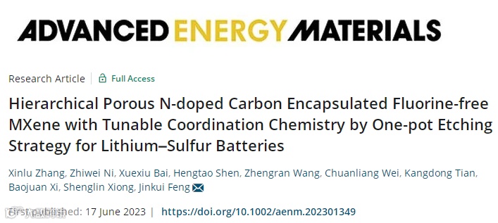 近日,山东大学冯金奎教授团队在国际知名期刊 Advanced Energy Materials上发表题为“Hierarchical Porous N-doped Carbon Encapsulated Fluorine-free MXene with Tunable Coordination Chemistry by One-pot Etching Strategy for Lithium–Sulfur Batteries”的研究性论文。该观点文章阐述了现在MXenes制备过程以及结构调控中存在的巨大挑战,提出一种绿色制备MXenes和调控其配位结构的新策略。