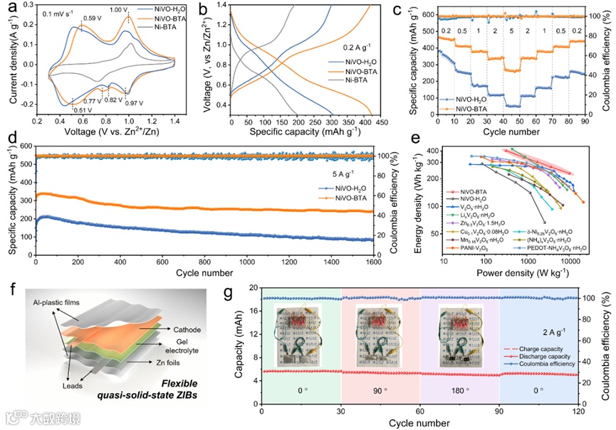 图4. 储锌性能。a) 在0.1 mV s-1的扫描速率下,相应电极在0.3-1.4 V的CV曲线;b) 在0.2 A g-1时的充放电曲线;c) 倍率性能;d) 5 A g-1时的长循环性能;e) Zn/NiVO-BTA电池与其他报道的钒基材料的性能比较;f) 柔性准固态ZIBs的结构示意图;g) 柔性准固态Zn/NiVO-BTA电池在2 A g-1在不同弯曲状态下的循环性能,插图显示准固态Zn/NiVO-BTA电池在相应的弯曲状态下点亮20个平行的发光二极管(LED)的光学图像。