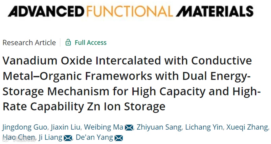 近日,天津大学的梁骥教授团队在国际知名期刊Advanced Functional Materials上发表题为“Vanadium Oxide Intercalated with Conductive Metal–Organic Frameworks with Dual Energy-Storage Mechanism for High Capacity and High-Rate Capability Zn Ion Storage”的文章。该文章通过有机配体和预先插入的Ni2+配位,将一维导电金属有机框架(Ni-BTA)插入到VOx的层间(NiVO-BTA)。插层的Ni-BTA通过π-d共轭提高了VOx的导电性,通过扩大其层间距促进了Zn2+的迁移,并作为层间支柱稳定了VOx的晶体结构,从而同时提高了材料的速率能力和循环稳定性。同时,Zn2+储存的双重反应机制,即VOx中V5+/V3+的氧化还原和Ni-BTA中化学键(C=N/C-N)的断键重排,共同促成了容量的提高。