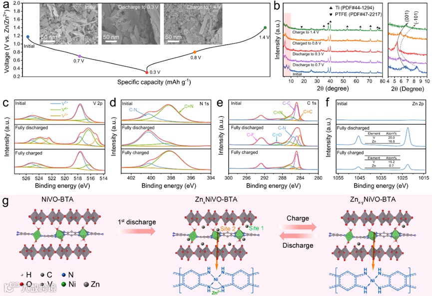图2. NiVO-BTA正极的储锌机制。a) 0.1 A g-1恒流电压曲线和不同状态下的SEM照片(插图);b) 非原位XRD图谱和所选区域内的放大图;c) V 2p,d) N 1s,e) C 1s,f) Zn 2p的非原位高分辨XPS图谱以及TEM-EDS中V和Zn的原子比;g)首次放电时Zn2+嵌入NiVO-BTA的示意图,以及后续充放电过程中Zn2+的嵌入/脱出示意图。