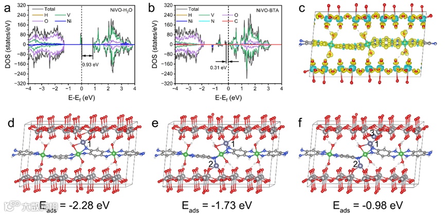 图3. NiVO-H2O和NiVO-BTA的DFT计算。a)NiVO-H2O,b)NiVO-BTA的态密度;c)NiVO-BTA的变形电荷密度分布(黄色:电荷增加;蓝色:电荷减少);计算模型和相应的Zn原子在d)1位点,e)1和2位点,f)所有位点上吸附能。