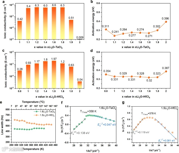 【图2】xLi2O-TaCl5和xLi2O-HfCl4非晶材料的锂离子电导率和锂离子扩散行为。(a,c)xLi2O-TaCl5和xLi2O-HfCl4的RT(25°C)离子电导率。(b,d)xLi2O-TaCl5和xLi2O-HfCl4电解质的活化能值。(e)1.6Li2O-TaCl5和1.5Li2O-HfCl4的静态7Li运动窄化光谱。(f,g)1.6Li2O-TaCl5和1.5Li2O-HfCl4的7Li SLR NMR速率的温度依赖性是在实验室参考框架中测量的。