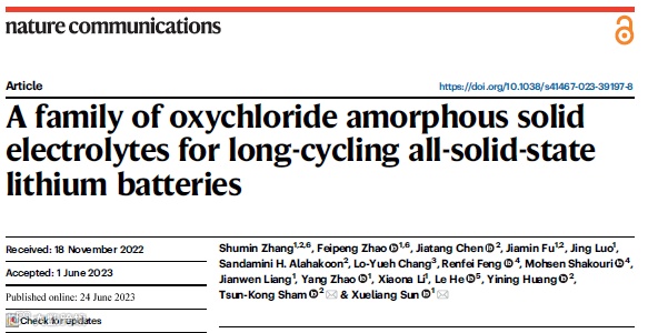 该研究以题目为“A family of oxychloride amorphous solid electrolytes for long-cycling all-solid-state lithium batteries” 的论文发表在著名期刊《Nature Communications》。