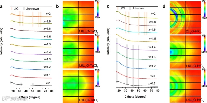 【图1】xLi2O-MCly(M=Ta或Hf)非晶材料的合成与晶体结构。(a,c)所制备的xLi2O-TaCl5(1≤x≤2)和xLi2O-HfCl4(0.8≤x≤2)的实验室XRD图谱。25°之前的宽峰是用于密封测试粉末以避免任何空气暴露的Kapton薄膜的衍射峰。(b,d)xLi2O-TaCl5(x=1.8、1.6和1.1)和xLi2O-HfCl4(x=2、1.5和1.4)的基于同步加速器的二维X射线衍射图像。