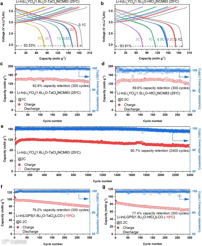 【图5】使用1.6Li2O-TaCl5或1.5Li2O-HfCl4无定形SE的ASSB的电化学性能。室温(RT,25°C)下使用1.6Li2O-TaCl5(a)和1.5Li2O-HfCl4(b)测量NCM83 ASSB的倍率性能。使用1.6Li2O-TaCl5(c)和1.5Li2O-HfCl4(d)的NCM83 ASSB的RT循环性能,以及使用1.6Li2O-TaCl5的NCM83 ASSB在2 C下的长寿命循环(e)。使用1.6Li2O-TaCl5(f)和1.5Li2O-HfCl4(g)的LCO正极ASSB的−10°C循环性能。
