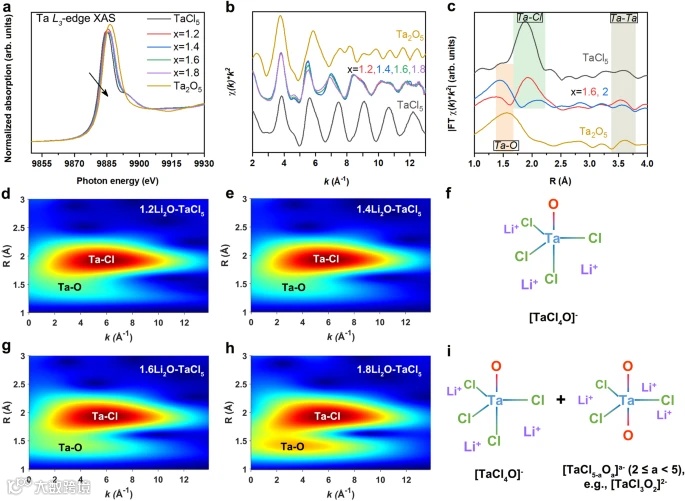 【图4】xLi2O-TaCl5非晶SE的局部结构分析。xLi2O-TaCl5非晶SE的XANES(a)、EXAFS(b)和FT-EXAFS(c),以及Ta L3边缘的Ta2O5和TaCl5。(d、e、g、h)1.2Li2O-TaCl5(d)、1.4Li2O-TaCl5(e)、1.6Li2O-TaCl5(g)和1.8Li2O-TaCl5(h)在Ta L3边缘的WT谱图k2加权。(f,i)xLi2O-TaCl5无定形SE中的局部结构示意图((f)中x=1.2和1.4;(i)中x=1.6和1.8)。(局部结构主要显示xLi2O-TaCl5非晶SE中可能的配位以及几何形状。键角和锂离子数并不十分准确。)