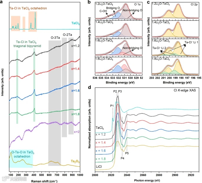 【图3】xLi2O-TaCl5非晶SE的结构表征和混合阴离子功能。(a)xLi2O-TaCl5化合物、Ta2O5和TaCl5的拉曼光谱。(b–d)xLi2O-TaCl5非晶SE的O 1s XPS(b)、Cl 2p XPS(c)和Cl K边XAS(d)。