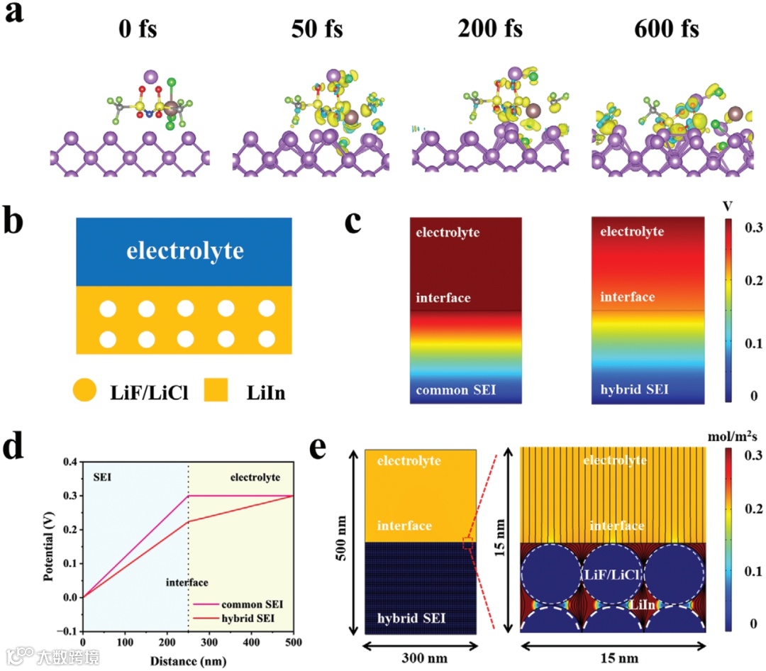 通过从头算分子动力学 (AIMD) 模拟以确认在锂金属表面构建稳定的 LiF/LiCl/LiIn 杂化 SEI。图 4a 显示了当 InCl3 位于靠近 Li 表面时的 TFSI- 分解序列。随着 C-S 键的断裂,金属锂表面的 TFSI-被逐步分解,并在 50 fs 内成功生成 LiCl,随后,在 200 fs 时观察到 LiF 的生成,并且 在 600 fs内也成功观察到 Li-In 合金的形成。FES模拟显示杂化SEI 中的电场分布更均匀,这有利于降低循环过程中的过电位。此外,图 4e 中模拟了混合 SEI 中锂离子通量的分布。当杂化SEI 的锂离子扩散系数远大于普通 SEI 时,杂化SEI 中自发重新分布的锂离子通量实现更快的锂离子传输。
