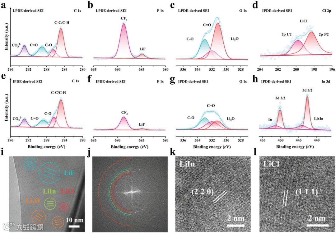 对循环后的锂金属表面进行XPS测试,测试结果表明 IPDE 与锂金属具有良好的相容性,在电池循环过程中产生表面的副产物(Li2CO3、Li2O等)。此外,通过 XPS 光谱成功确定了 LiCl 和 LiIn 成分的存在。因此,可以得出结论,在锂金属表面生成了富含 LiF 且含有 LiCl 和 LiIn 组分的杂化SEI。进一步,通过冷冻透射电镜技术直接可视化 SEI 的纳米结构。图 3i 显示,在 Cu 网格上成功生成了由 LiF、LiCl、LiIn 和 Li2O 组成的均匀SEI,这通过相应的快速傅里叶变换得到证实(图 3j)。此外,还给出了高分辨率透射电镜图像,以进一步证明在Li和IPDE之间的界面处存在 LiIn (220) 和 LiCl (111) 纳米晶体成分(图 3k,l)。
