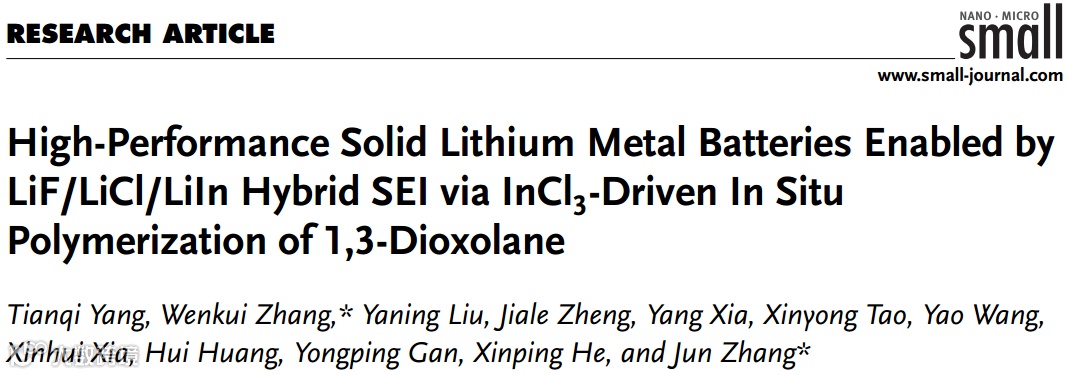 近日,来自浙江工业大学的张文魁教授和张俊教授在国际知名期刊Small上发表题为“High-Performance Solid Lithium Metal Batteries Enabled by LiF/LiCl/LiIn Hybrid SEI via InCl3-Driven In Situ Polymerization of 1,3-Dioxolane”的观点文章。该文章分析了路易斯酸InCl3作为DOL开环聚合引发剂的机理及电化学性能研究,提出了一种通用的路易斯酸引发策略并实现LiF/LiCl/LiIn杂化SEI的构建,从而获得稳定的锂负极,助力构建高性能固态锂金属电池。