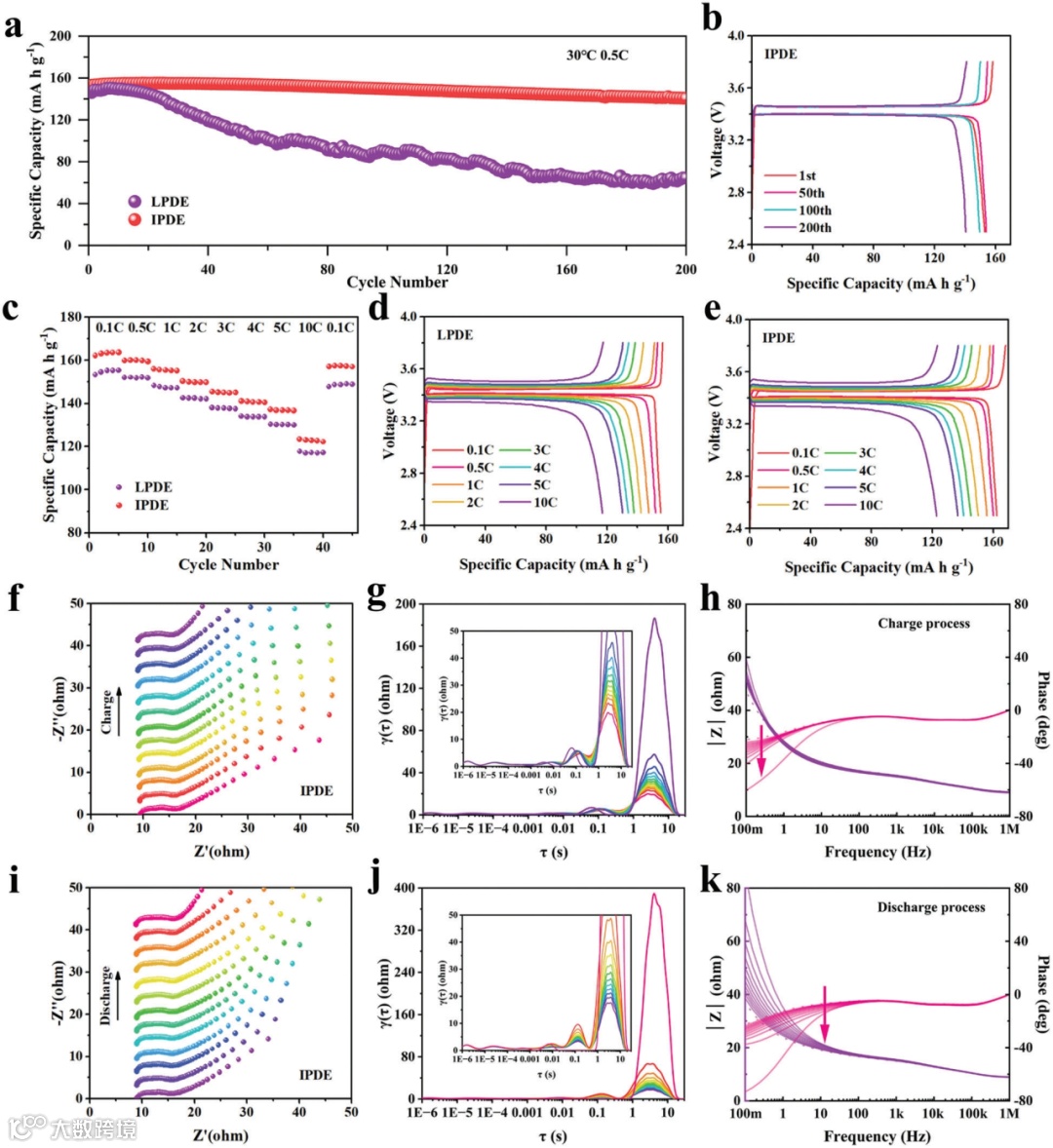 在10 mAh g−1的等容量间隔下对LiFePO4/IPDE/Li电池进行了原位恒电流电化学阻抗谱测试,以揭示电池循环过程中阻抗的实时演变。EIS阻抗谱分别以Nyquist 图和 Bode 图的形式呈现。在循环过程中,在 Nyquist 图(图 2f,i)和 Bode 图(图 2h,k)中均没有观察到界面阻抗的显着增加和相位的明显变化。通过弛豫时间分布(DRT)技术进一步分析 EIS阻抗谱,总阻抗可以根据弛豫时间从小到大细分为五个部分:欧姆阻抗(R0)、SEI 阻抗( RSEI), 正极界面电荷转移阻抗 (Rct1), 负极界面电荷转移阻抗 (Rct2) 和 Warburg 阻抗 (Rw)。图 2g,j 显示 LFP/IPDE/Li 电池中各部分的电阻值均很小,且在循环过程中没有显着变化,Rct2 表现出良好的可逆性,证明了稳定的 SEI 在电池循环过程中的成功生成。