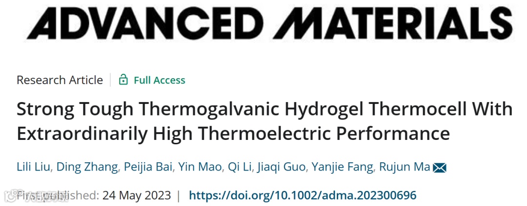 近日,南开大学马儒军教授团队在国际知名期刊《Advanced Materials》上发表题为“Strong tough thermogalvanic hydrogel thermocell with extraordinarily high thermoelectric performance”的文章。该工作将拉伸诱导结晶和热电化学效应相结合,制备了一种高热电性能的强韧可拉伸聚乙烯醇热电水凝胶。